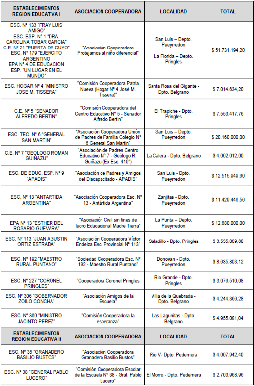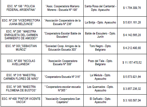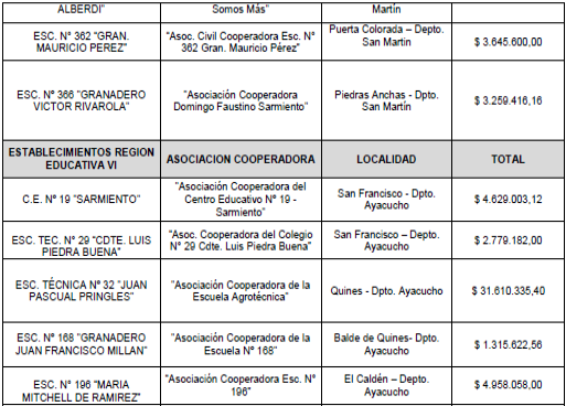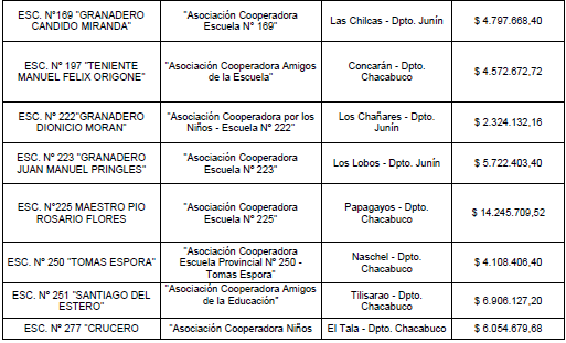 Que en act. NOTEDU 3635592/25 (adjuntos), obra detalle de las Asociaciones Civiles / Cooperadoras de los establecimientos educativos públicos provinciales beneficiados con dicho subsidio;